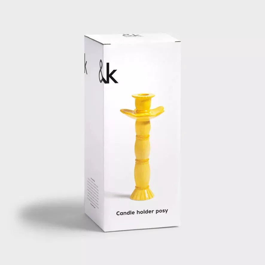 De Posy kandelaar large van &klevering heeft een diameter van 10,5 centimeter en een hoogte van 24 centimeter. De kaarsenhouder is gemaakt van dolomiet met een gele afwerking. Je kunt de kandelaar schoonmaken met een vochtige doek.