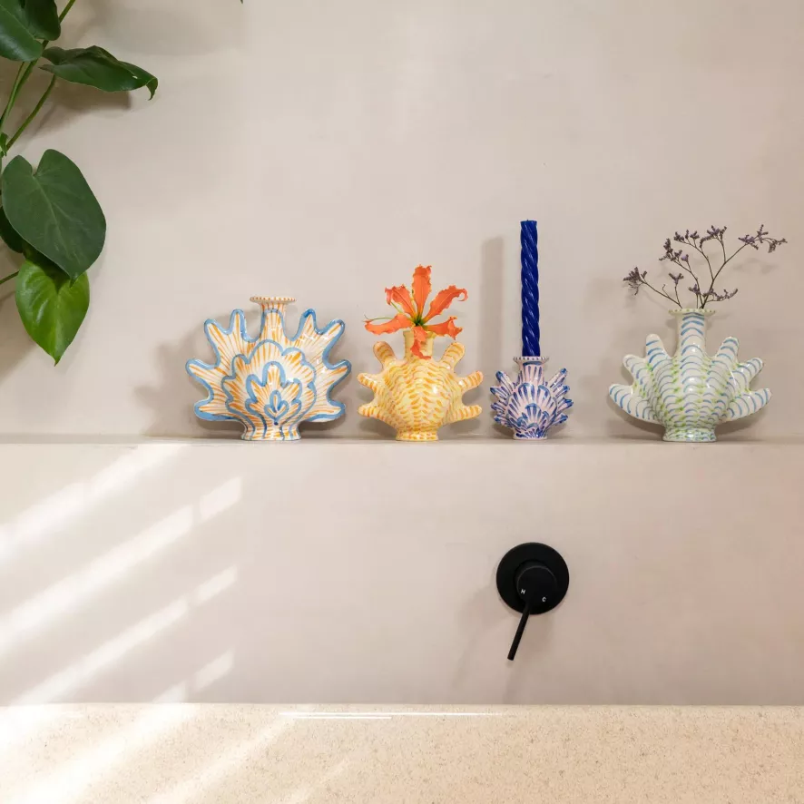 De Shellegance kandelaar medium van &klevering is ontworpen door Lucie de Moyencourt. De kaarsenhouder heeft een lengte van 19 centimeter, een breedte van 8,5 centimeter en een hoogte van 15,5 centimeter. De kandelaar is gemaakt van keramiek en is afgewerkt met een speels patroon in blauw en groen. Je kunt de kandelaar schoonmaken met een vochtige doek.